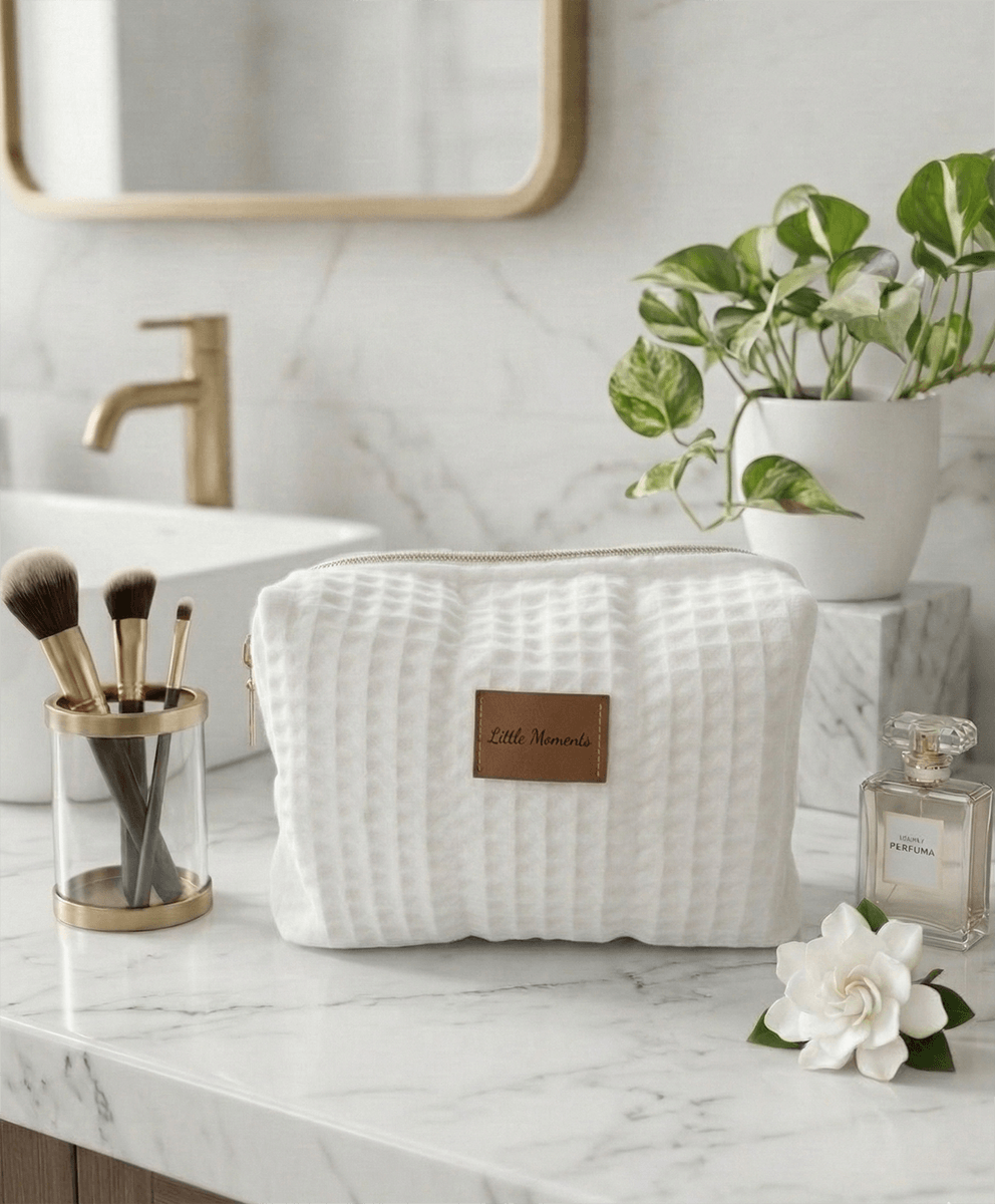Επενδυμένο με την χαρακτηριστική τρισδιάστατη waffle ύφανση που χαρίζει την απόλυτη premium αίσθηση ενός luxury spa, το Little Moments αποτελεί το ιδανικό μέγεθος για να μεταφέρετε τα καθημερινά σας makeup & skincare essentials, ή τα ευαίσθητα προϊόντα περιποίησης του παιδιού σας. Η διακριτική δερμάτινη λεπτομέρεια με το μήνυμα “Little Moments” μας υπενθυμίζει να εκτιμάμε την ομορφιά που κρύβεται στην καθημερινότητα.