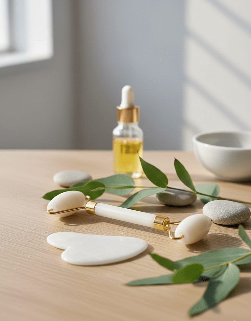 Gua Sha (Sculpting): Ειδικό εργαλείο γλυπτικής που ανορθώνει το περίγραμμα του προσώπου (V-Shape), λειαίνει τις λεπτές ρυτίδες και ανακουφίζει από την ένταση των μυών.